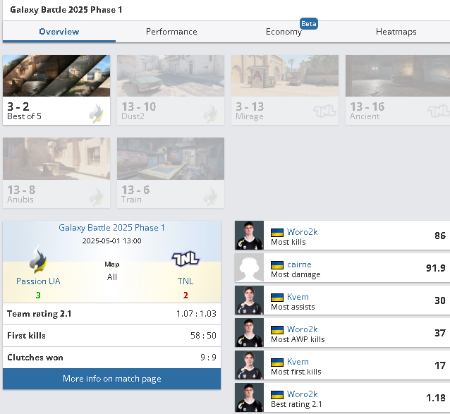 Це була швидка розправа з боку TNL. Вони тотально контролювали карту: 9 раундів у першій половині, потім ще 4 одразу після зміни сторін – і гру закінчено. Passion UA змогли взяти лише три раунди на початку, після чого повністю втратили ініціативу. Найкращі показники тут знову продемонстрував cairne.
