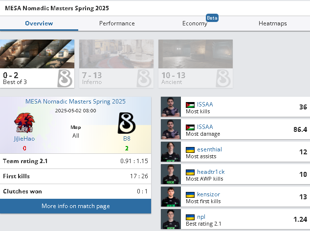 Український колектив B8 здобув впевнену перемогу над JiJieHao у вирішальному матчі групового етапу турніру MESA Nomadic Masters Spring 2025 з CS2. Протистояння завершилося з рахунком 2:0 – 13:7 на карті Inferno та 13:10 на Ancient.