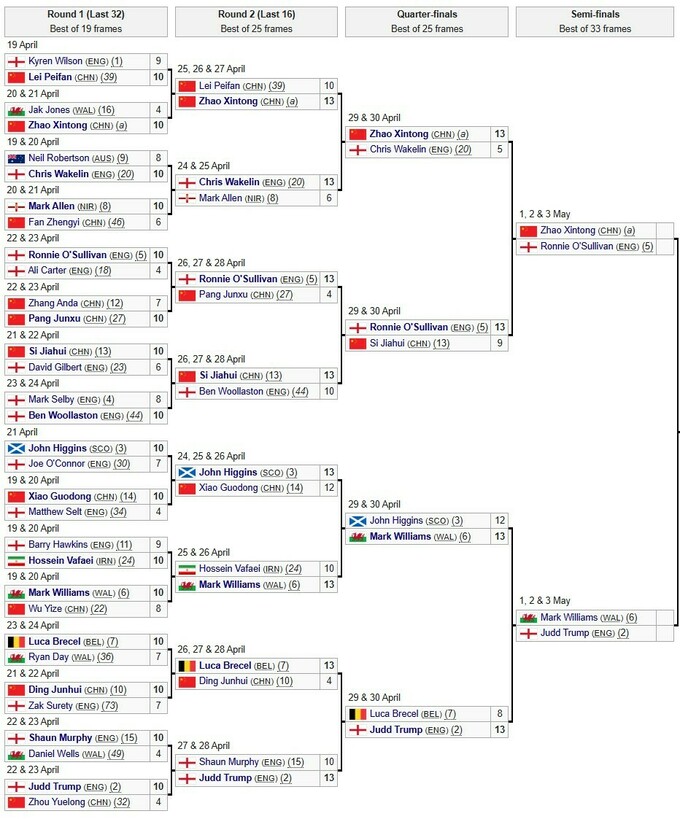 2 травня Чжао і Ронні грають о 12:00 (друга сесія) та 21:00 (третя сесія), Марк і Джадд вийдуть на арену о 16:30. Півфінали триватимуть до 3 травня, а фінал у Шеффілді заплановано на 4 і 5 травня.