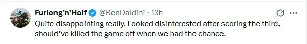 Furlong’n’Half: Дуже розчаровує насправді. Виглядали байдужими після третього гола, треба було закінчувати гру, коли була така нагода.