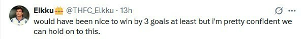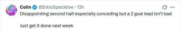 Colin: Розчаровуючий другий тайм, особливо пропущений м'яч, але перевага в 2 голи – це непогано. Просто зробіть це наступного тижня.