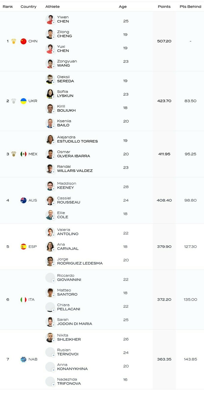У підсумку збірна України завершила виступ із сумою 423.70 бали та здобула срібло. Переможцем стала команда Китаю (507.20), третє місце посіла Мексика (411.95).