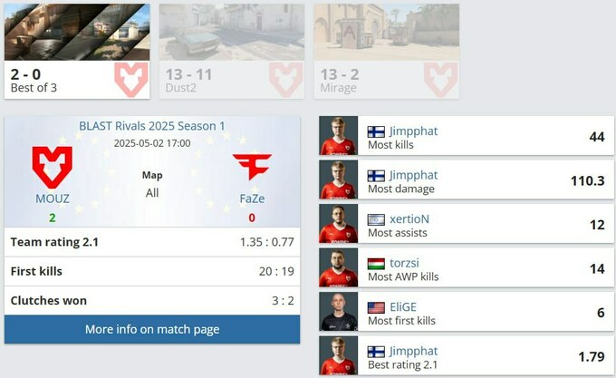Команда MOUZ пробилася до півфіналу BLAST Rivals Season 1, обігравши FaZe з рахунком 2:0 – 13:11 на Dust2 та 13:2 на Mirage. Ключову роль у перемозі відіграли Доріан «xertioN» Берман та Джимі «Jimpphat» Сало, які разом оформили 86 фраґів, продемонструвавши вражаючу перевагу в стрільбі.