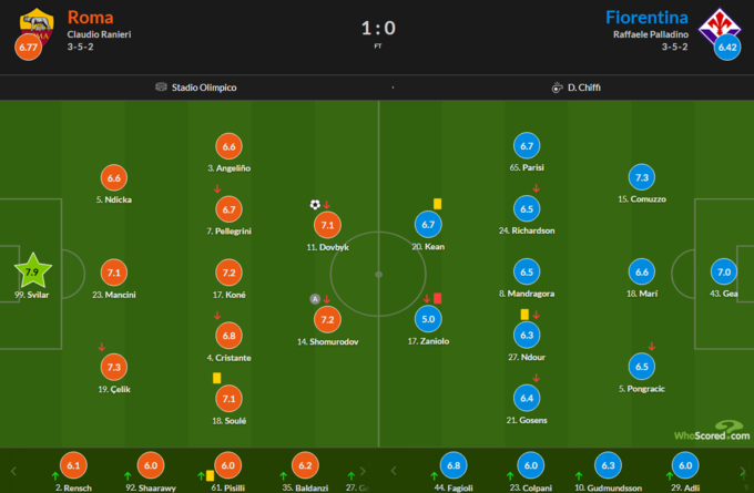 Український нападник «Роми» Артем Довбик провів на полі 77 хвилин і відзначився переможним голом своєї команди. Статистичні портали SofaScore і WhoScored оцінили його гру в 7.4 і 7.1 балів відповідно.