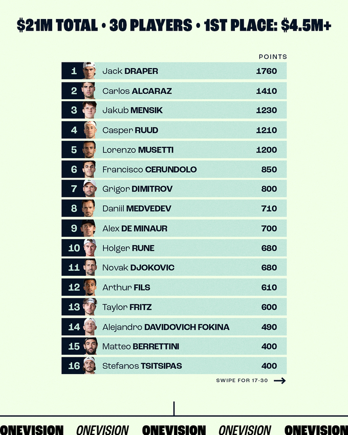 А от Новаку Джоковичу доведеться серйозно постаратися, щоб наздогнати лідерів — він ділить лише 10-те місце з Хольгером Руне, у обох по 680 очок.