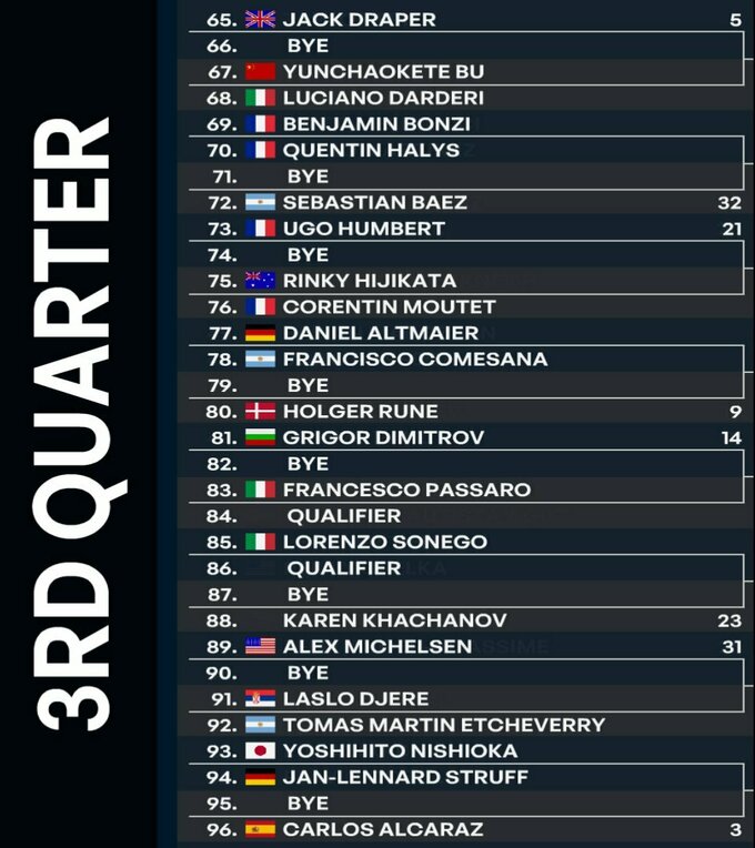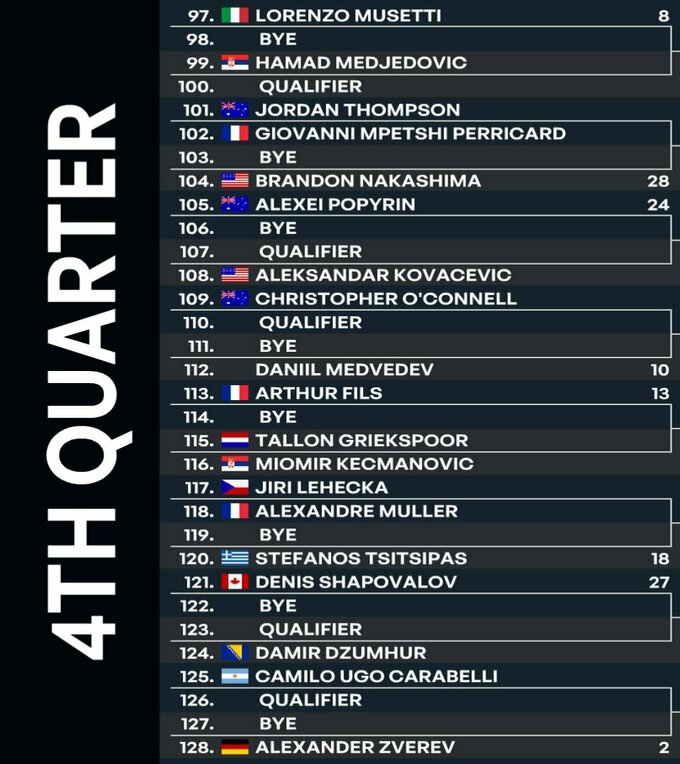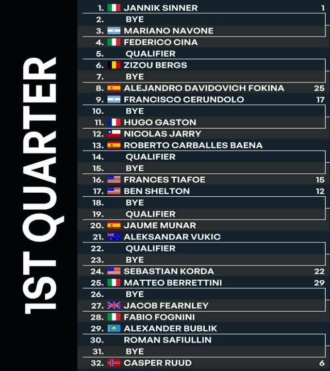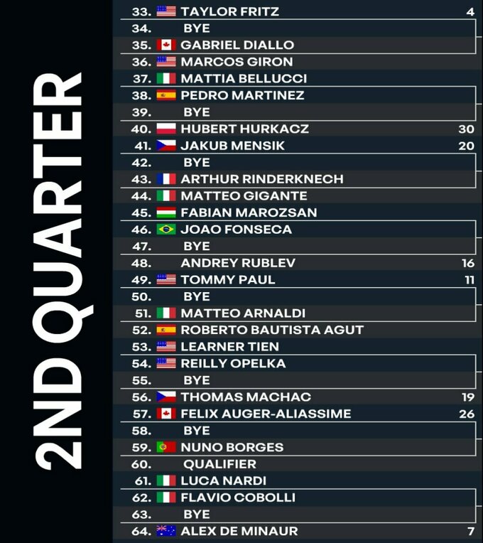 Відзначимо також четвертого і п'ятого сіяних – Тейлора Фрітца і Джека Дрейпера. У Фрітца у другому колі можливий або Габріель Діалло, або Маркос Хірон, а у Дрейпера – Бу Юнчаокете або Лучано Дардері.