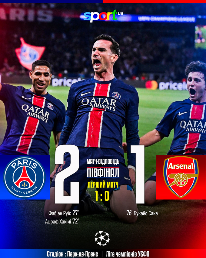 - 07.05. 22:00. ПСЖ (Франція) – Арсенал (Англія) – 2:1 (перший матч – 1:0)