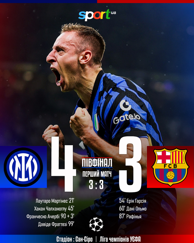 - 06.05. 22:00. Інтер (Італія) – Барселона (Іспанія) – 4:3 (д.ч.) (перший матч – 3:3)
