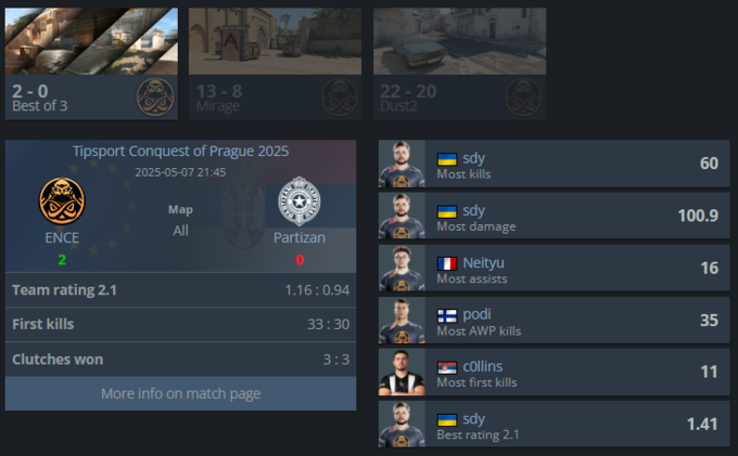 Команда ENCE у складі з Віктором «sdy» Оруджевим переграла сербський клуб Partizan Esports. Зустріч завершилася з рахунком 2:0.