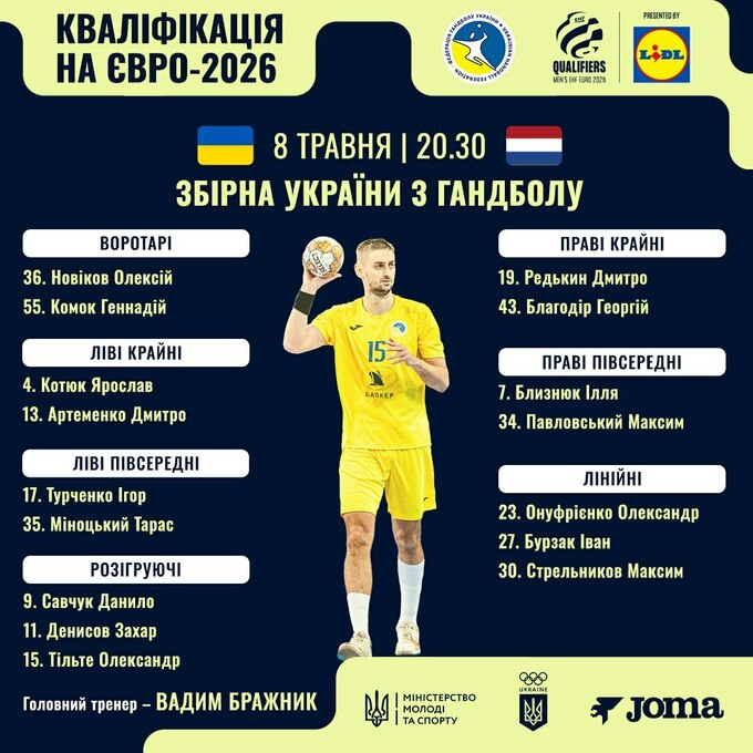 Склад збірної України з гандболу на матч проти Нідерландів: