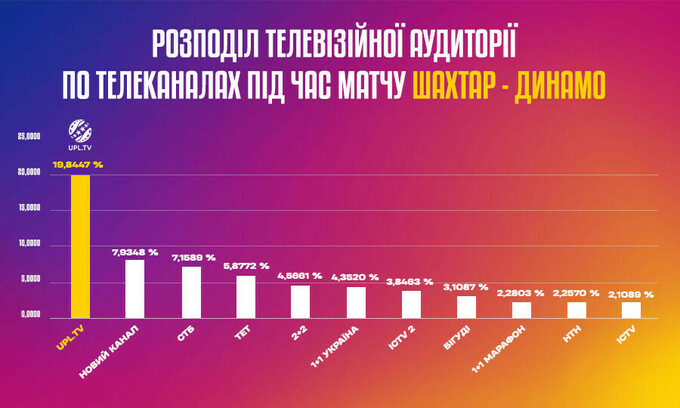 За даними агенції Bigdata, під час матчу Шахтар – Динамо телеканал УПЛ ТБ зібрав найбільшу частку аудиторії серед понад 300 українських телеканалів (колосальні 19,8%), значно випередивши загальнонаціональні інформаційні та розважальні канали.