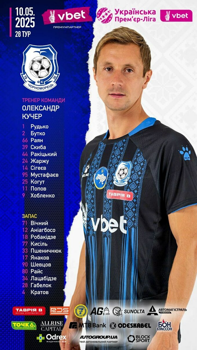 «Чорноморець»: Рудько – Раян, Ракіцький, Жаржу, Скиба, Бутко – Мустафаєв (Габелок, 80), Сігеєв (Єрмаков, 66), Когут (Робакідзе, 80) – Попов (Шевцов, 66), Хобленко (Пшеничнюк, 90+2).