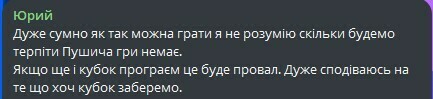Юрий: Дуже сумно як так можна грати я не розумію скільки будемо терпіти Пушича гри немає. Якщо ще і Кубок програєм це буде провал. Дуже сподіваюсь на те що хоч Кубок заберемо.