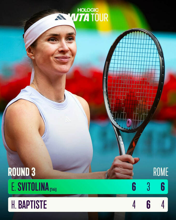 Svitolina digs deep @ElinaSvitolina defeats Baptiste 6-4, 3-6, 6-4 to advance in Rome!#IBI25 pic.twitter.com/n9Xw042QiA