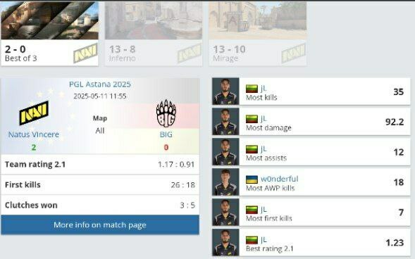 NAVI перемогли німецький клуб BIG з рахунком 2:0 (13:8 на Inferno, 13:10 на Mirage) та опинились за крок від виходу у плей-оф. Команда повертає впевненість, а фанати – надію на великий результат у Казахстані.