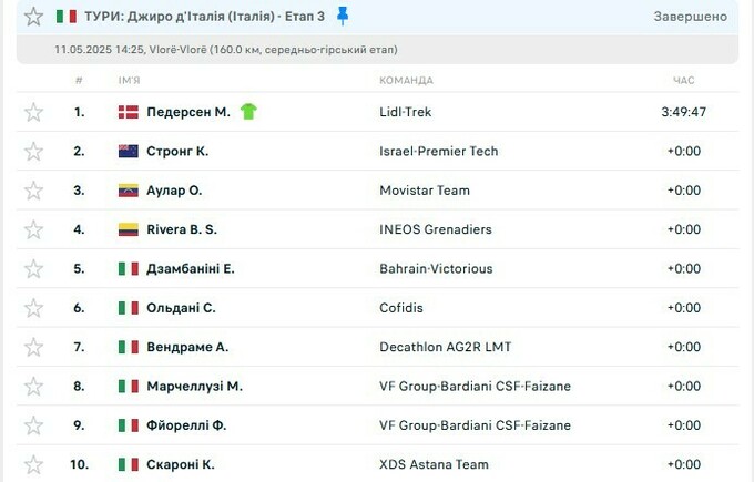 У неділю, 11 травня, пройшов третій етап шосейного гранд-туру Giro d'Italia 2025. Першим фінішну межу перетнув Мадс Педерсен із команди Lidl-Trek.
