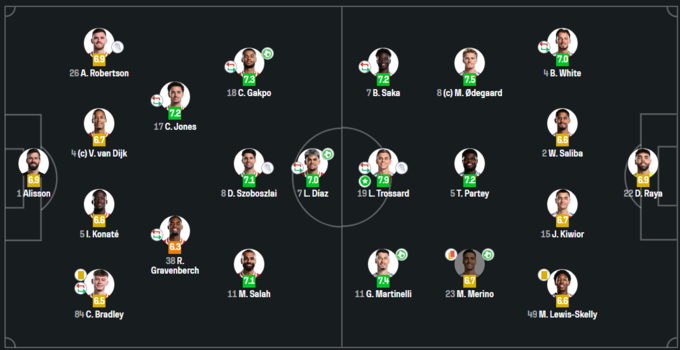 Український фулбек «Арсеналу» Олександр Зінченко з'явився на полі на 88-й хвилині, результативними діями не відзначився. Статистичні портали SofaScore і WhoScored оцінили гру українця в 6.7 і 6.1 бала.