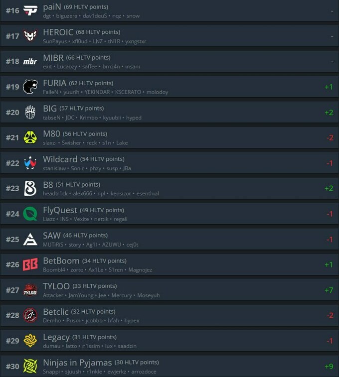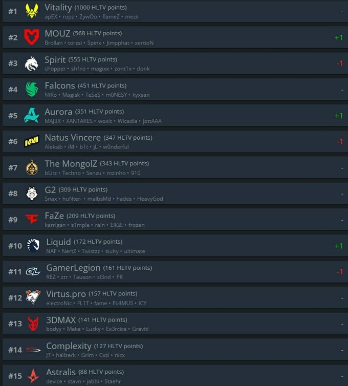 На друге місце піднявся MOUZ, який обійшов spirit, у свою чергу росіяни опустились на третю сходинку. Четвертими залишаються Falcons, які втримали свою позицію без змін. Aurora покращила свій результат і піднялася з шостого на п’яте місце, обійшовши Natus Vincere, які, навпаки, опустилися на одну сходинку вниз і тепер займають шосту позицію.