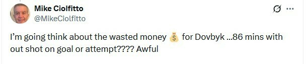 Mike Ciolfitto: Я зараз думаю про витрачені гроші за Довбика... 86 хвилин без жодного удару по воротах чи спроби???? Жахливо.