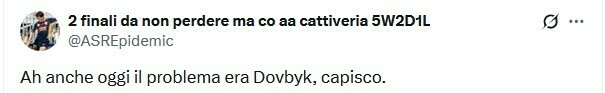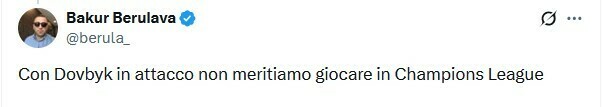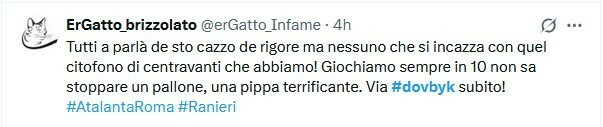 ErGatto_brizzolato: Всі говорять про цей чортовий пенальті, але нікого не бісить наша ситуація з центральним нападником! Ми завжди граємо вдесятьох, він не може зупинити м'яч, він жахливий невдаха. Іди Довбик зараз!