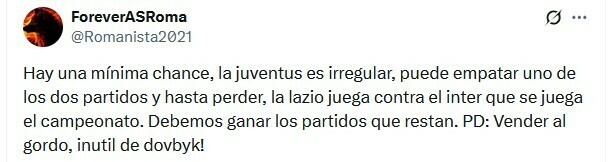 ForeverASRoma: Є невеликий шанс. Ювентус грає непослідовно, вони можуть зіграти внічию в одному з двох матчів або навіть програти. Лаціо грає проти Інтера, який бореться за чемпіонство. Ми повинні виграти решту матчів. P.S.: Продайте жирного, ні на що не здатного Довбика!