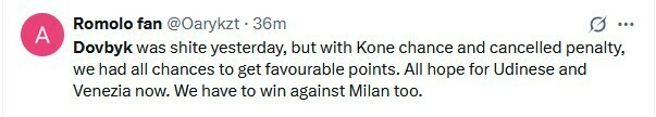 Romolo fan: Довбик вчора був жахливий, але з моментом, коли Коне провів матч, і скасував пенальті, у нас були всі шанси здобути вигідні очки. Тепер уся надія на Удінезе та Венецію. Ми також маємо виграти у Мілана.