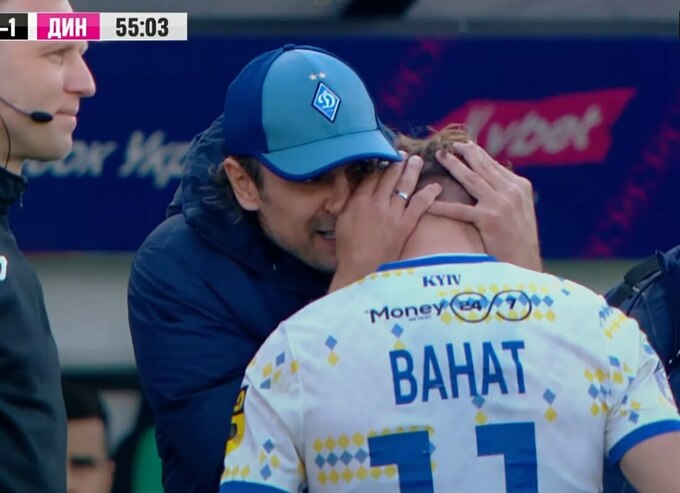 Цікавий кадр вийшов через кілька хвилин після ситуації. Наставник Динамо Олександр Шовковський заспокоював Владислава Ваната, який явно розбушувався.
