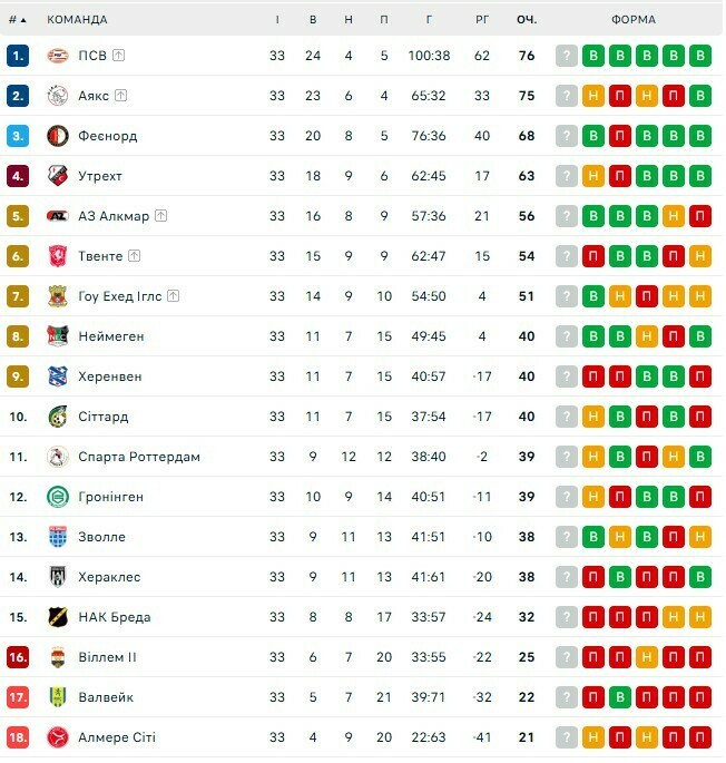 Лідери в Нідерландах: ПСВ (76 очок), Аякс (75), Фейєнорд (68), Утрехт (63), АЗ Алкмаар (56), Твенте (54).