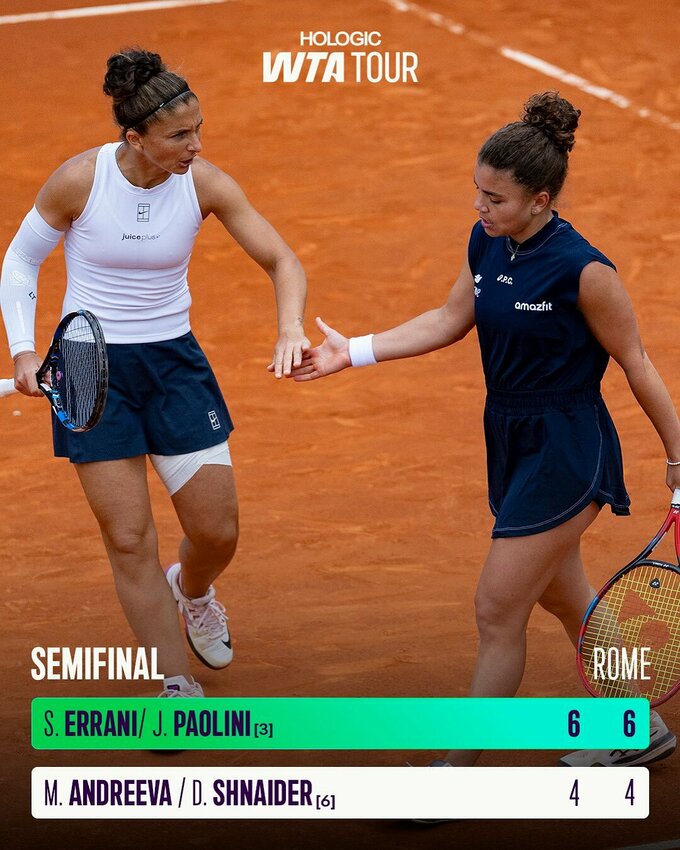FORZA!! 🇮🇹@SaraErrani and @JasminePaolini advance to the final with a 6-4, 6-4 win over Andreeva and Shnaider in Rome!#IBI25 pic.twitter.com/Pwy0a2s0Lh