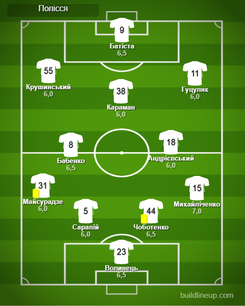 «Полісся»: Волинець – Майсурадзе (Хадрой, 73), Сарапій, Чоботенко, Михайліченко – Бабенко, Андрієвський – Крушинський, Караман (Йосефі, 59), Гуцуляк – Батіста (Брістрич, 73)