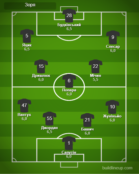 «Зоря»: Сапутін – Вантух (Тронтель, 74), Джордан, Башич, Жуніньйо – Дришлюк (Білоцерковець, 66), Попара, Мічин (Кораблін, 88) – Яцик, Слесар (Горбач, 74), Будківський
