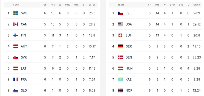 У матчі іншої групи США розгромили Казахстан і вийшли на друге місце з 14 очками, але у Чехії та Швейцарії є гра в запасі. Всім цим командам бажано виграти групу, щоб у чвертьфіналі уникнути поєдинку з Канадою, Швецією чи Фінляндією.