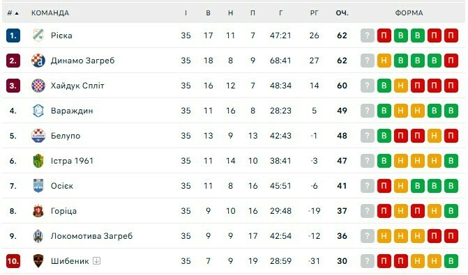 Лідери перед останнім туром: Рієка (62), Динамо Загреб (62), Хайдук (60).