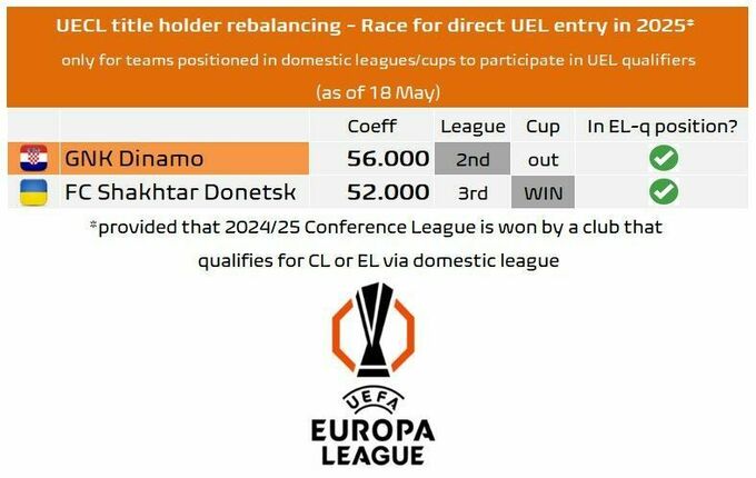 Ребаланс у ЛЄ можливий, якщо переможець Ліги конференцій (фінал буде зіграно 28 травня: Бетіс – Челсі) також отримає путівку в єврокубки через свій чемпіонат. Тоді одне місце в основі ЛЄ звільниться і буде передано клубу з найвищим рейтингом серед учасників кваліфікації – Динамо Загреб або Шахтарю.