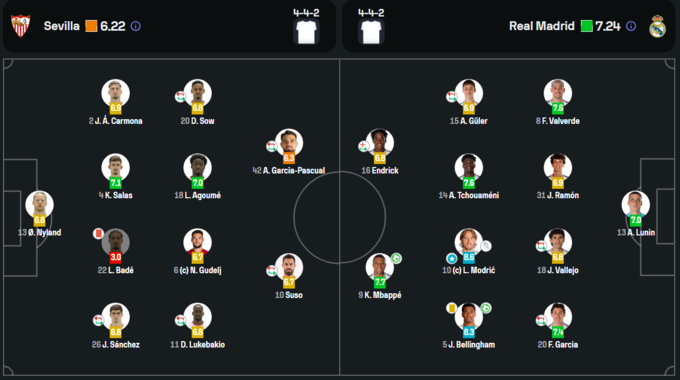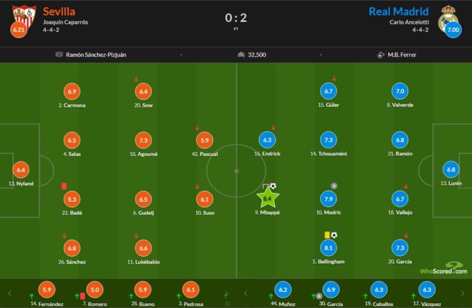 Український голкіпер мадридського «Реала» Андрій Лунін провів на полі весь матч, не пропустив жодного гола, зробив 1 сейв. Статистичні портали SofaScore і WhoScored оцінили його гру в 7.0 і 6.8 балів відповідно.