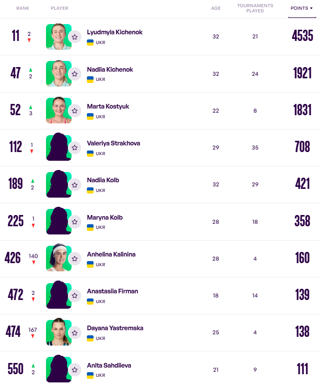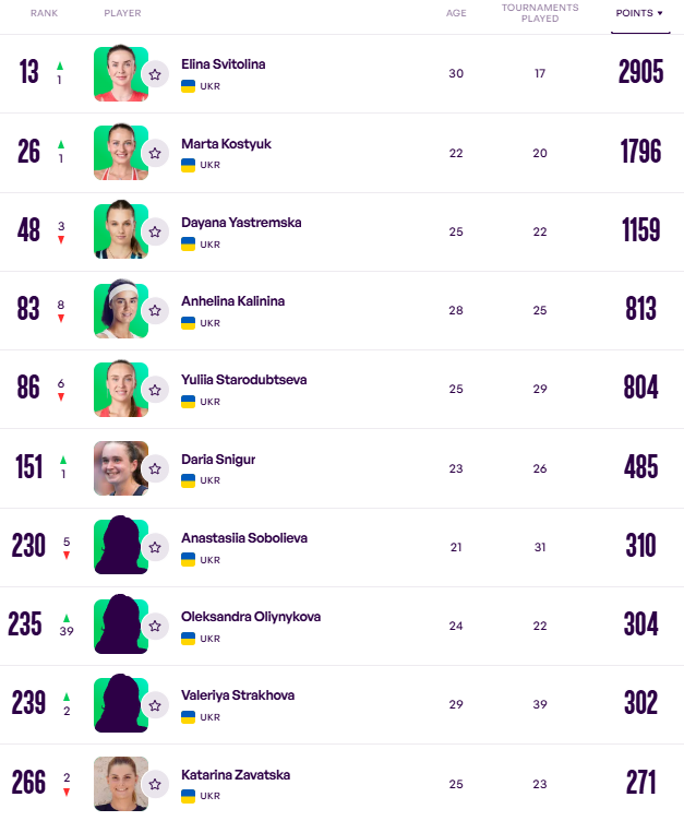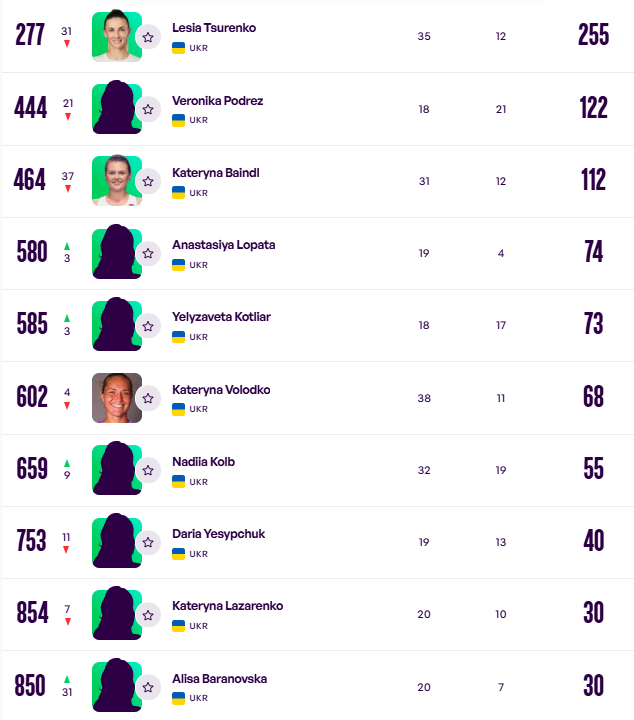 Падіння в рейтингу продовжує Леся Цуренко (мінус 31 місце), яка про завершення кар'єри не оголошувала, але у 2025 році поки так і не зіграла.