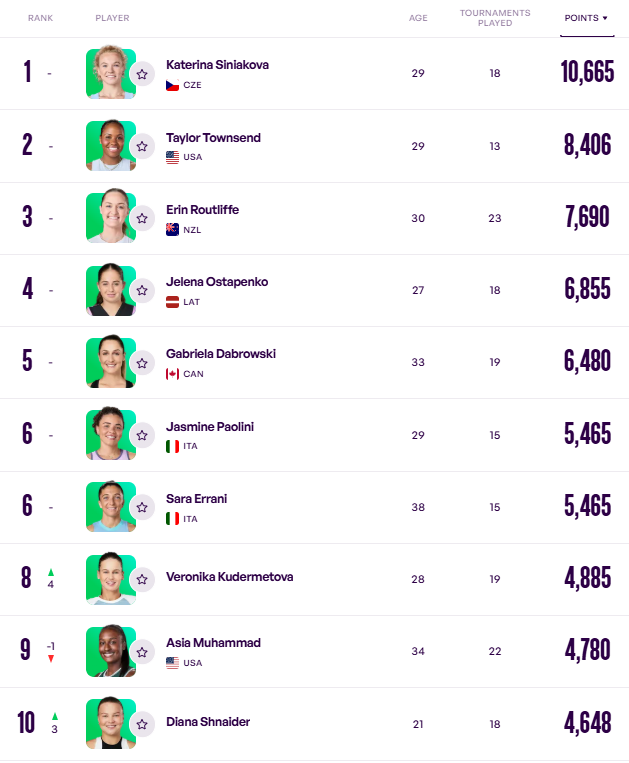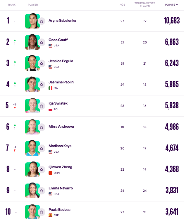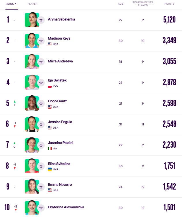 Лідером гонки залишається Аріна Соболенко. До першої п'ятірки також входять Медісон Кіз, Мірра Андрєєва, Іга Свьонтек і Коко Гофф.