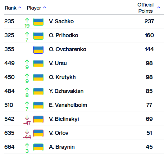 Практично всі українці (і не дуже) покращили позиції, окрім В'ячеслава Белінського (мінус 47) і Владислава Орлова (мінус 44).
