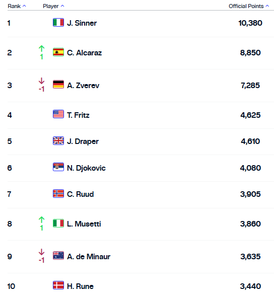 Синнер зберігає лідерство, Звєрєв йде третім, далі – прірва в 2600 очок
