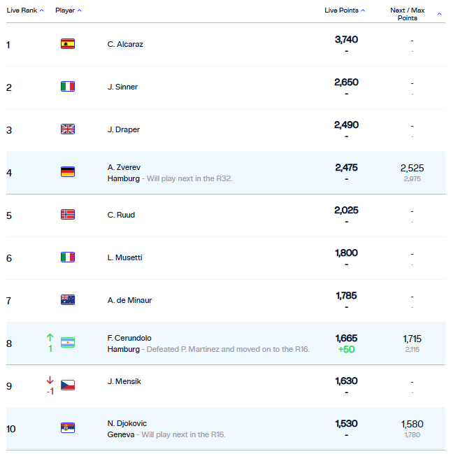 Алькарас знову став другою ракеткою світу, змістивши на третю позицію Александра Звєрєва (німець не зумів захистити трофей у Римі). Сіннер залишається лідером рейтингу.