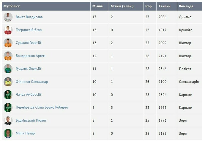 У списку найкращих голеадорів сезону лідирує Владислав Ванат (17 голів)