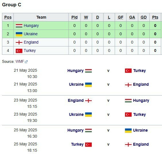 На груповому етапі ЧС-2025 українська збірна зіграє з Угорщиною, Англією та Туреччиною. 32 команди розділені на 8 груп по 4 збірні. Для виходу в 1/8 фіналу потрібно посісти перше або друге місце у квартеті.