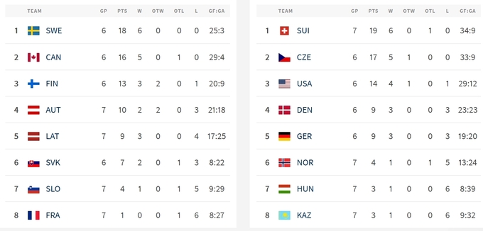 У групі A Австрія у матчі за вихід до чвертьфіналу турніру обіграла Латвію з рахунком 6:1. Досить несподіваний результат дозволив Австрії набрати 10 очок і посісти четверте місце.