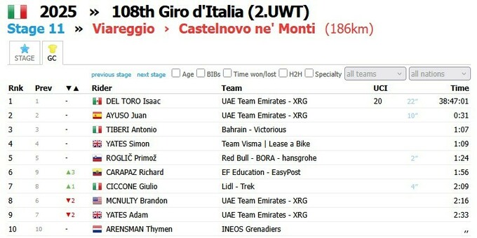 Після одинадцятого етапу лідером генеральної класифікації залишається Ісаак Дель Торо. Хуан Аюсо відстає на 31 секунду.