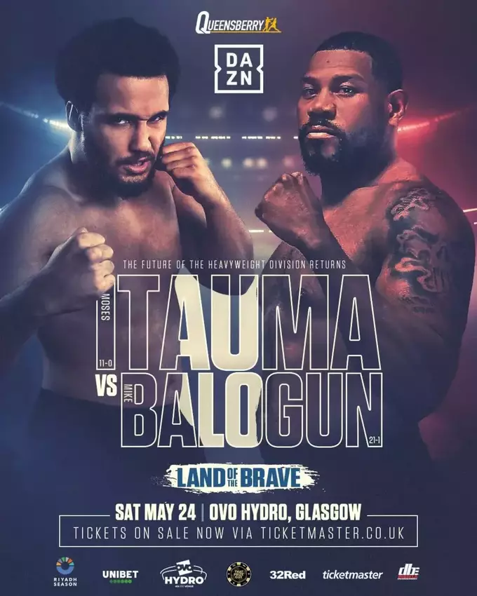 У головному карді відбудеться поєдинок суперважкої ваги (понад 90,7 кг) між непереможеним британцем Мозесом Ітаумою (11–0, 9 КО) та американцем Майклом Балогуном (21–1, 16 КО).