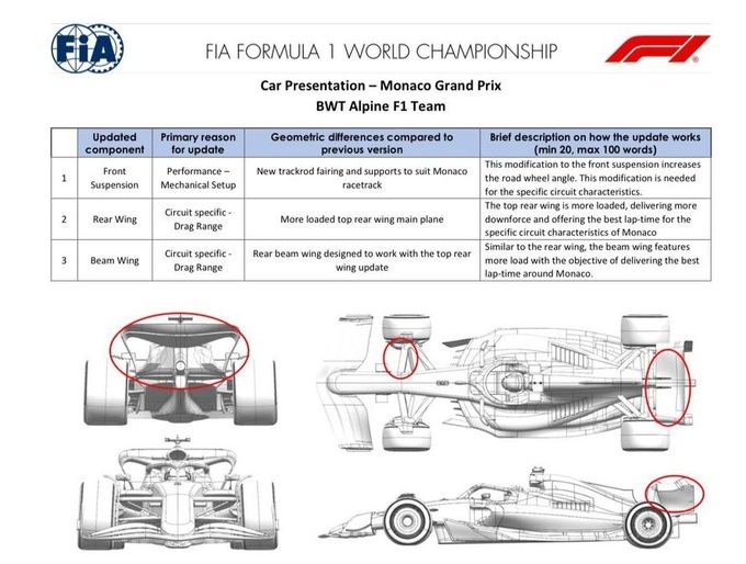 Французька команда зробила ставку на керованість. Оновлено форму оперення в зоні рульової тяги – це дає змогу краще розкривати потенціал шасі на повільних ділянках. Також в Альпін встановили заднє крило і бім-крило з високим рівнем притискної сили, що покращило зчеплення у другому і третьому секторах.