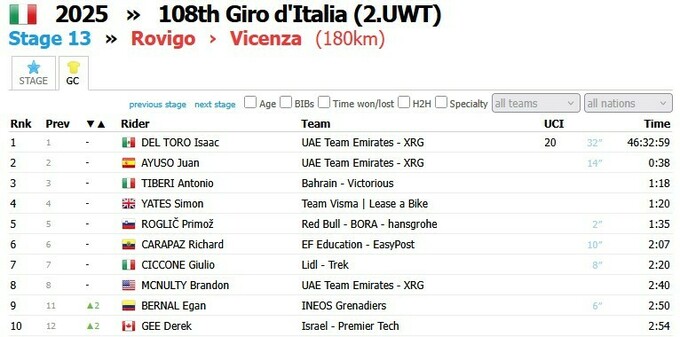 Після тринадцятого етапу лідером генеральної класифікації залишається Ісаак Дель Торо. Хуан Аюсо відстає на 38 секунд.