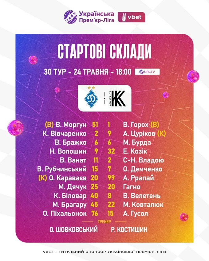 У суботу, 24 травня, відбудеться поєдинок 30-го туру Української Прем'єр-ліги, в якому зустрінуться київське «Динамо» та ковалівський «Колос». Матч пройде у Києві на стадіоні «Динамо» імені Валерія Лобановського, гра розпочнеться о 18:00.