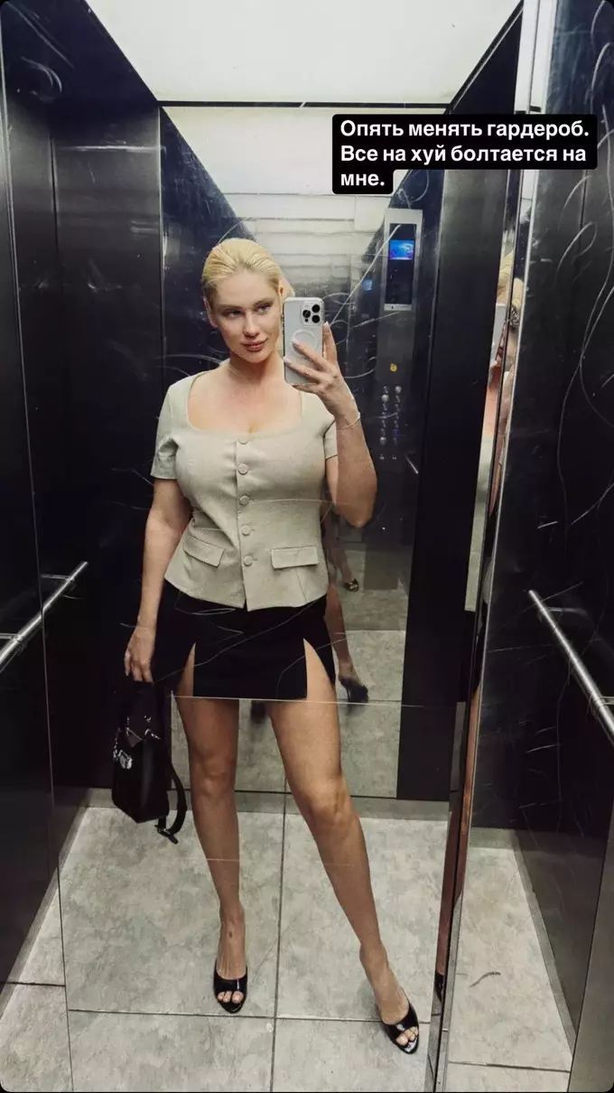 У соцмережах вона опублікувала фото в ліфті — в жакеті з декольте, міні-спідниці та на підборах.