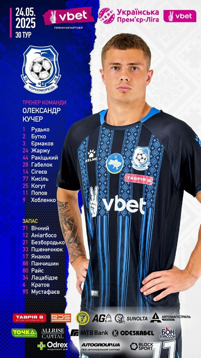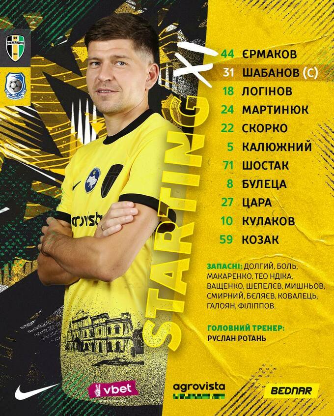 Запасні: Долгий, Макаренко, Ндіка, Шепелєв, Бєляєв, Смирний, Боль.